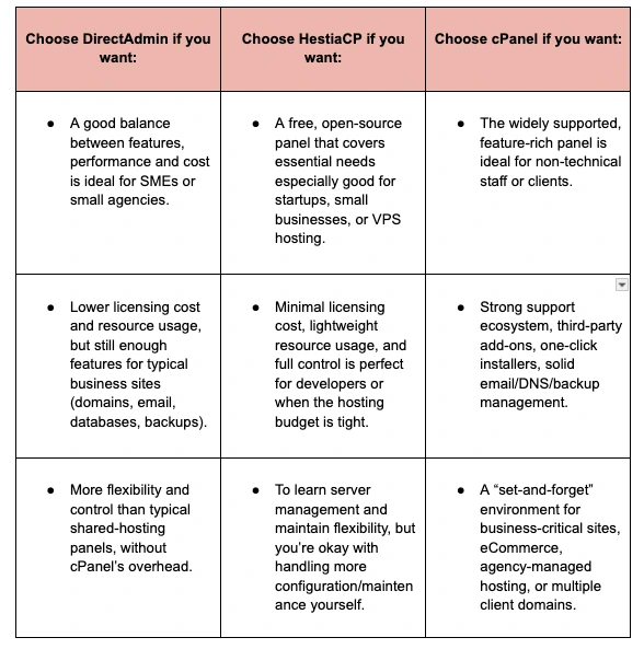 Although there is no one-size-fits-all answer. The “best” control panel depends on your business size, budget, technical capacity, long-term plans, and how much control vs. convenience you need.