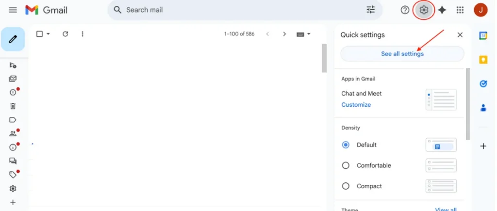 Click the gear icon (⚙️) at the top right corner of Gmail. From the drop-down menu, click on “See all settings.”