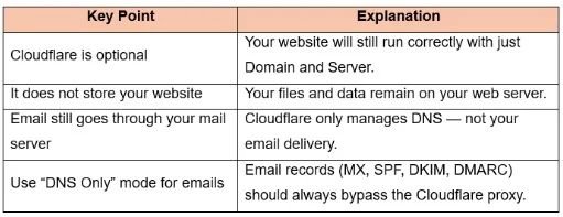 Cloudflare acts as an optional performance and security layer — not a core component of your website setup. If you want your website to load faster, stay more secure, and handle high traffic smoothly, Cloudflare is worth enabling. But if your site is small or your server already has strong security and caching in place, your website will function just as well without it.