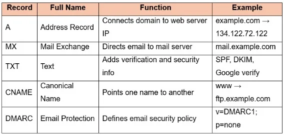 Inside the server (or Cloudflare, if you use it as DNS manager), there are a few key “records” that tell the internet exactly what to do. These records act like instructions or signboards for your domain.