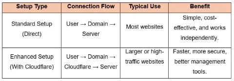 - The Enhanced Setup (Domain → Cloudflare → Server) — used when extra protection and performance are desired.